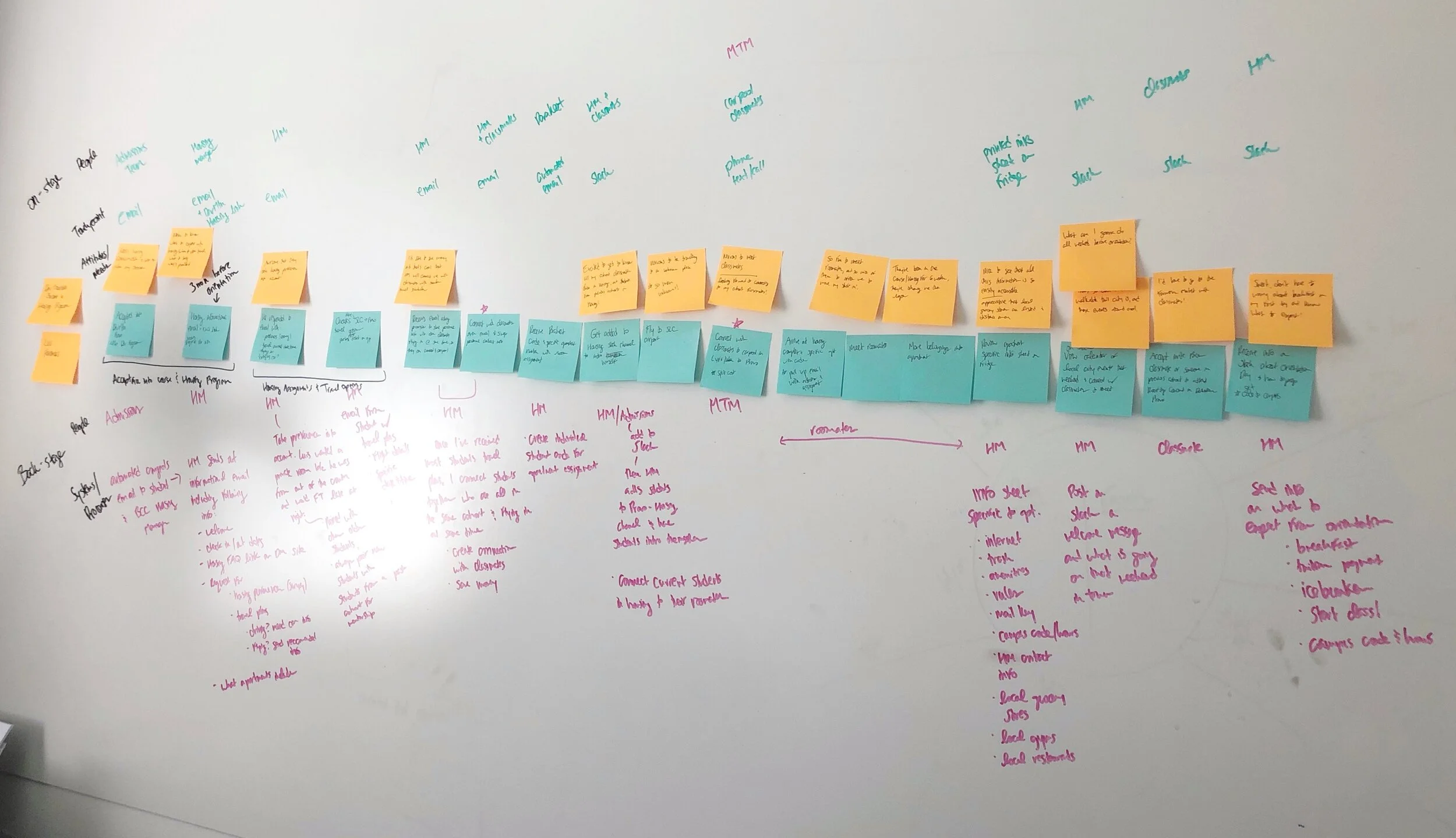 Based on the data, I drew out the current process and marked places where improvement was necessary. Students needed vital housing information soon after they were accepted in order to make travel plans. So, all students were contacted 3 months prior to their start date with specific housing check-in information. If students had questions prior to that 3 month touch point, they were guided to the Campus and Housing Manager for their location. This person became the student’s main point of contact for all questions and concerns during the housing process.